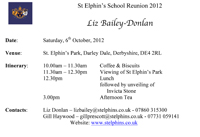 In June 2011 I approached Audley with a view to holding a school reunion at St Elphin's Park in October 2012. The next 16 months resulted in numerous e-mails and meetings regarding the reunion. In the meantime, in October 2011, it was suggested that the Old Elphinians (formerly St Elphin's Old Girls' Guild) have their AGM and Reunion on the same date so that we could have one event with approximately 50 ex-pupils and teachers present! Once word got out that we were having the event at the school, interested numbers escalated. At a meeting with Audley in February 2012 it was established that the prospective numbers were too high for them to cope with and, therefore, we had to split it into two events. The main reunion would still be held on 6th October, 2012 and the AGM & Reunion would be held on 13th October, 2012 (primarily for members of the Old Elphinians).