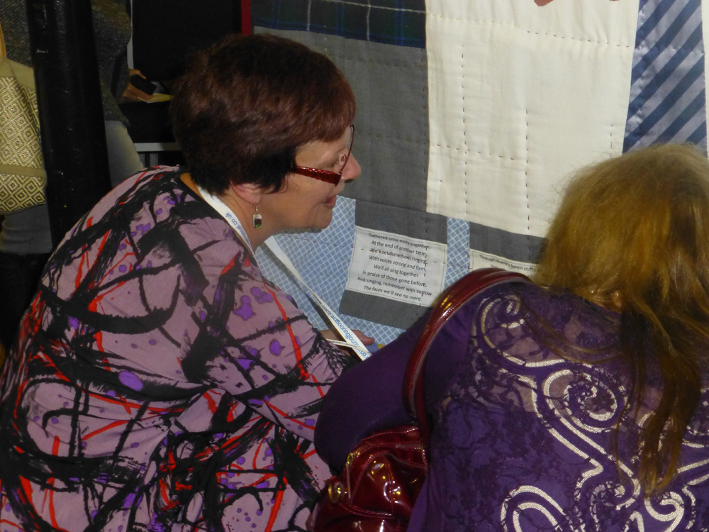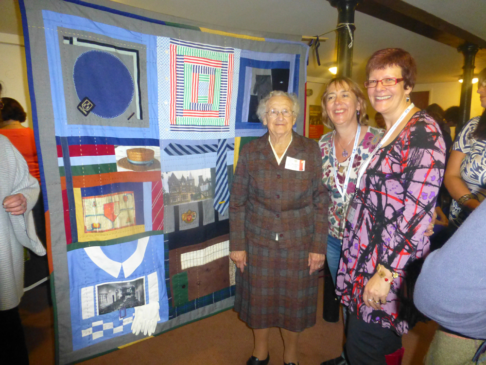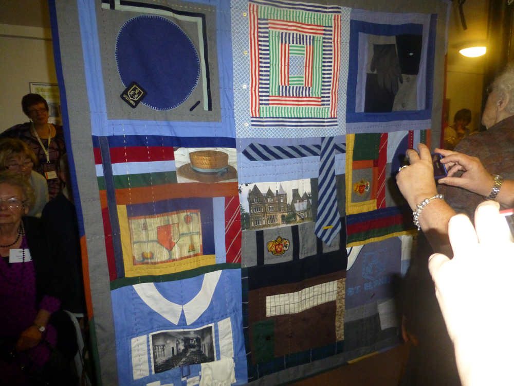 The unveiled quilt provided much cause for conversation as those present pointed out the different fabrics and and textures and reminisced about the pieces. Each square portrayed a different aspect of school life including berets and boaters, summer dresses, Sunday suits and Sunday silks, the chapel and choir veils, house colours, school cloaks, sports uniform, badges, even our old ‘temporary’ wooden classrooms were represented. The reverse comprised of an original school sheet, included a linen bag, a gingham apron, a tartan skirt, school ties, a teddy bear representing the soft toys we all had and the four verses of the school song printed in order along the bottom.