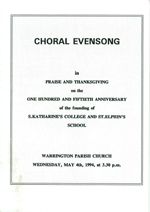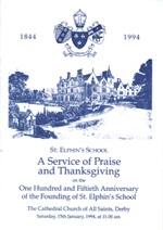 A Service of Praise and Thanksgiving on the 150th Anniversary of the Founding of St Elphin's School was held at The Cathedral Church of All Saints, Derby on Saturday, 15th January, 1994 (1844 - 1994) at 11.00am.