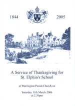 A Service of Thanksgiving for St Elphin's School was held at Warrington Parish Church on Saturday, 11th March, 2006 at 2.30pm (1844 - 2005).