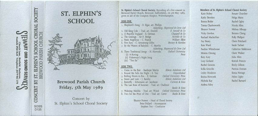 Thanks to Renate Mason who found her copy of a cassette recorded by St Elphin's School Choral Society in May 1989 at Brewood Parish Church.