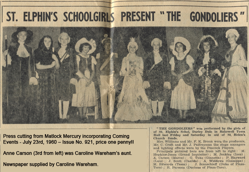 Thanks to Caroline Wareham for providing a newspaper Matlock Mercury from July 22nd, 1950 in which there was a piece entitled "St. Elphin's Schoolgirls Present "The Gondoliers". Anne Carson (3rd from left) was Caroline's Aunt.