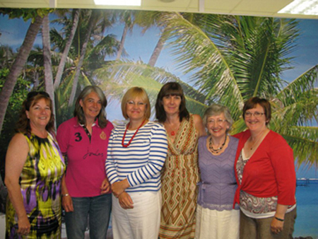 Right: LtoR: Bev Elks, Julie Drake, Marianne J. (nee Stewart), Anne Marie Reeve (nee Robinson), Arlene Garnier (nee Bailey) and Liz Donlan (nee Bailey) meet up for a holiday in the Caribbean! (Well, actually it was Downtown, near Grantham!!). The backdrop was in the Travel Department at Downtown!!