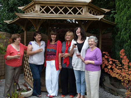 Left: LtoR: Liz Donlan (nee Bailey), Caroline Wareham, Anne Marie Reeve (nee Robinson) Marianne J. (nee Stewart), Gill Haywood (nee Prescott), Arlene Garnier (nee Bailey) enjoying a meet up in the garden of Liz & Mike Donlan (Photo: Mike Donlan)