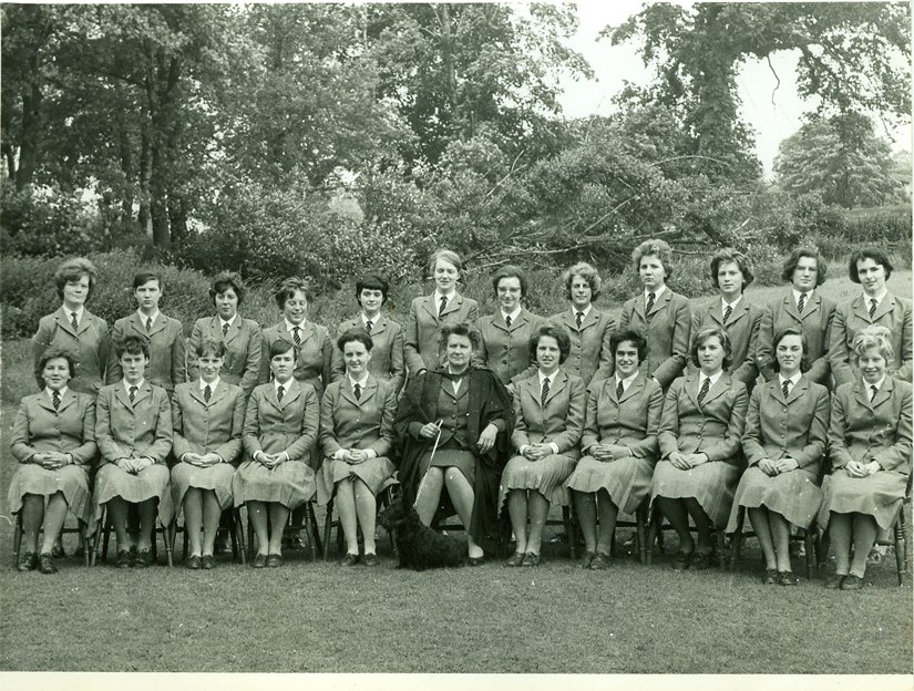 Front Row: Ruth Dean / Mary Guest / Judith Carter / Grace Bews / Betty Jones (Head Girl) / Miss Robinson (Head Mistress) with Chloe (the dog!) / Philippa Watson (Deputy Head Girl) / Jennifer de Gruyther / Ann Niblock / Ann Lavin / Hilda Scott