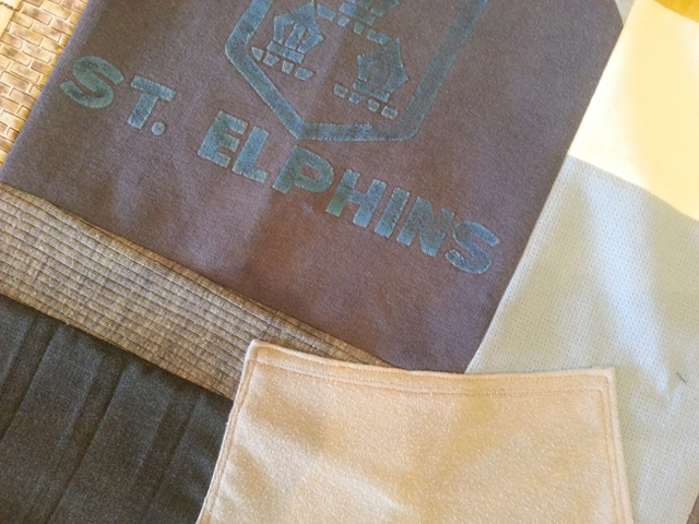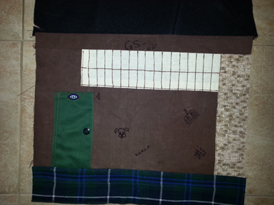 There are blazers, skirts, a Sunday Silk, ties, badges, linen bags, a choir head cover, socks, baggy britches (grey bags), gloves, a sheet, summer dress belts, a shoe polish bag and more that will find their way into the quilt.