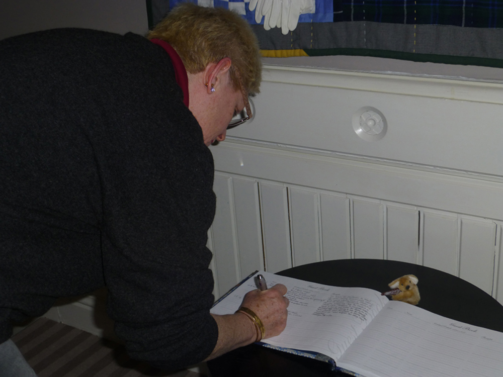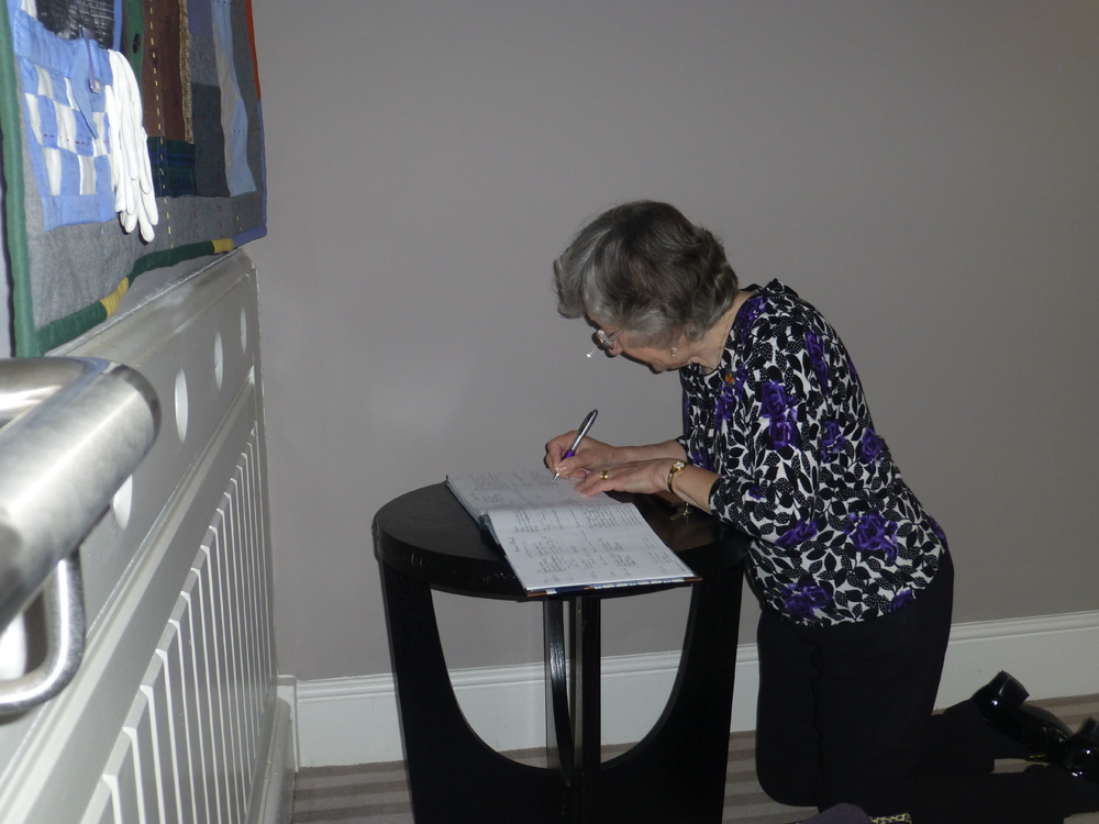 Please feel free to go and view the Quilt at any time but make sure you ask permission to go up Front Stairs first as we have to remember that it now belongs to residents! Also, make sure you sign the Guest Book and, if possible, have a photo of yourself taken at the side of the Quilt and/or signing the book.