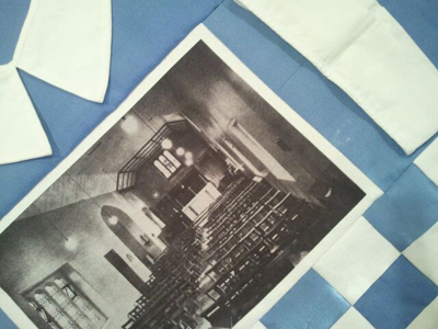 Another of the photographs, this one of the Main School building (possibly taken in 2005 by Jenny Mitra). They edited it (removed a green car from the image) and had it transferred onto an old white school sheet. They used some school blue material for the sky and an old school tie, a piece of pleated skirt and a border along the bottom of Sunday suit interspersed with black cloak and, finally, added the school crest badge from a blazer.